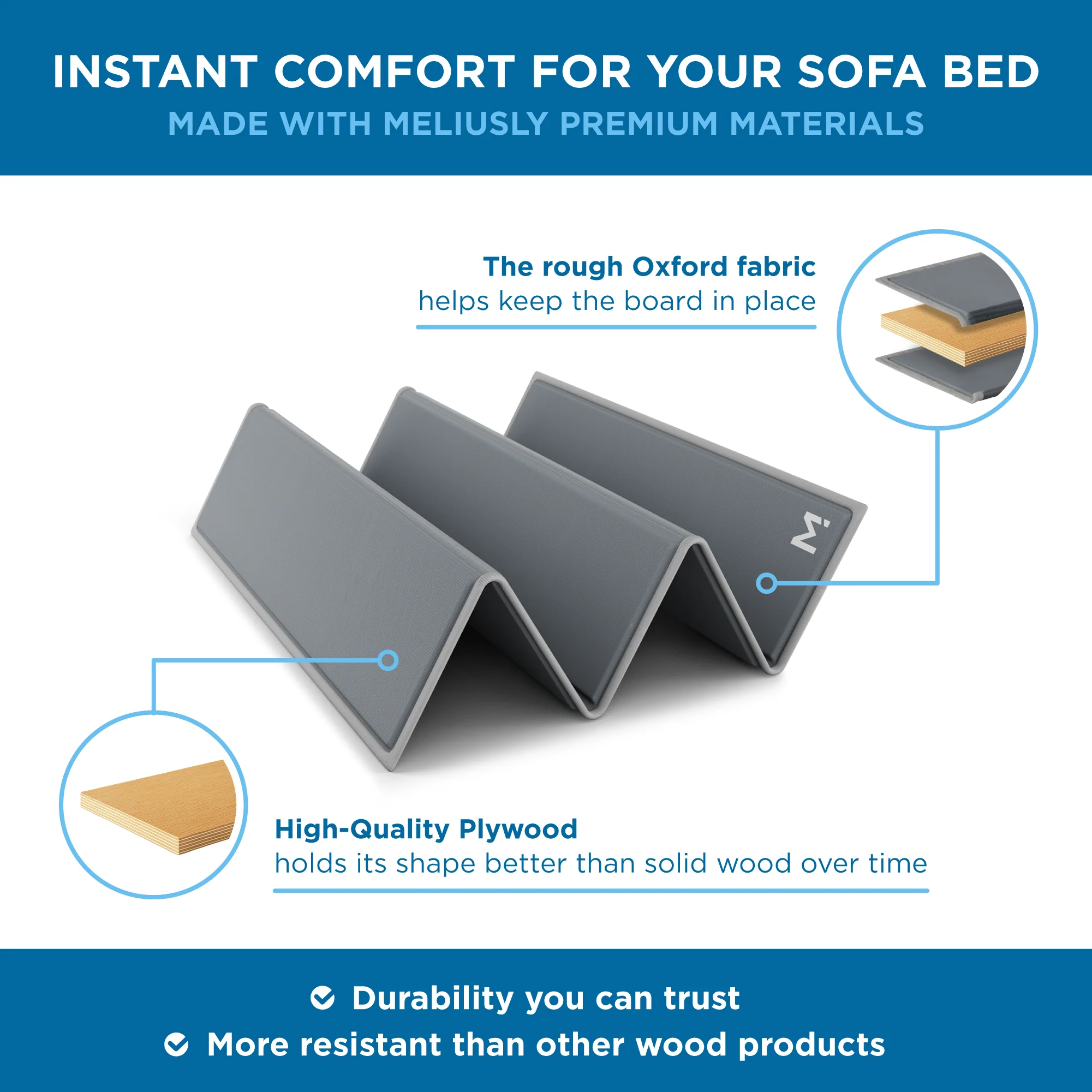 - REINFORCED PLYWOOD CONSTRUCTION — This sofa bed mattress support board is built from premium plywood panels wrapped in durable industrial-grade fabric. The rigid panels sit between the frame and mattress, distributing weight evenly across the entire sleeping surface. The Original sofa bed board for under mattress support, engineered to eliminate dips, sags, and pressure points.